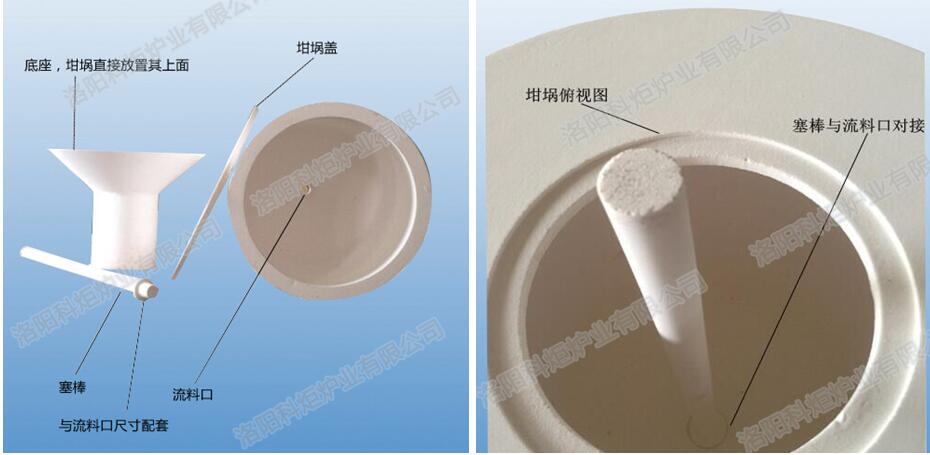 此陶瓷熔块炉是将一个漏斗式坩埚置于炉内,将配好的熔块料直接从上边投入坩埚内,坩埚底部有圆形孔流料口,由一根长塞棒与坩埚底部流料孔密封对接。通电加热,在加热时塞棒处于下压状态(在自身重力下),与流料孔密封接触,保证加热过程不外漏。加热完成之后将塞棒向上提拉,开始放料。相反如果松开塞棒,则停止流料;如需不同流速,可采用不同直径的短塞子与长塞棒成套来控制。当温度上升到指定温度时,熔块成熔融状态,由下面的流料孔(坩埚底部有个孔)自动流入下面的容器中。在更换坩埚时,可降下升降平台,方便更换。